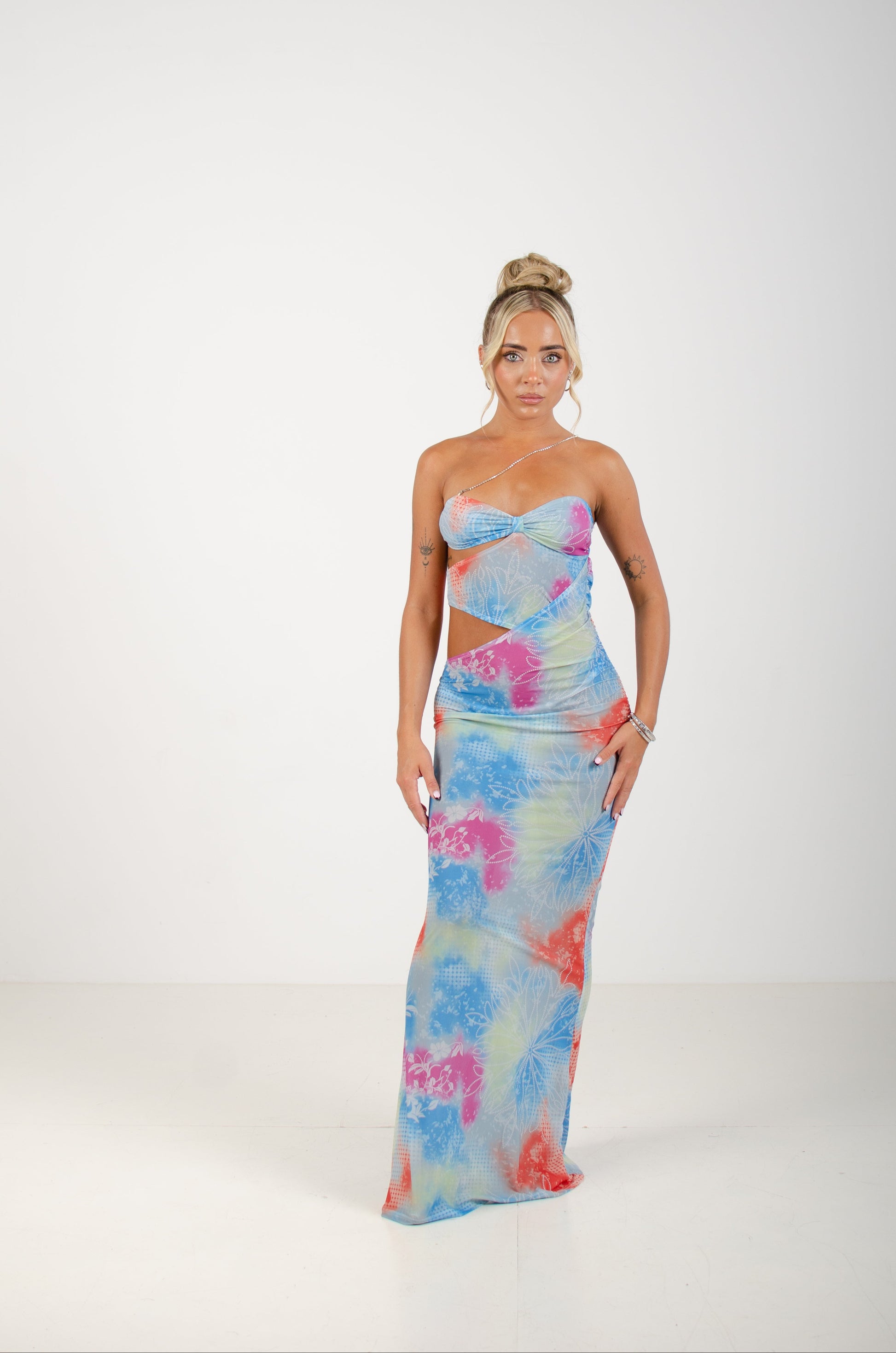 one diamante strap bodycon maxi features a vibrant, abstract floral print in a dreamy palette of blues, reds, purples, and sunset orange tones. The ruched bust and figure-hugging mesh fabric flatter every curve,