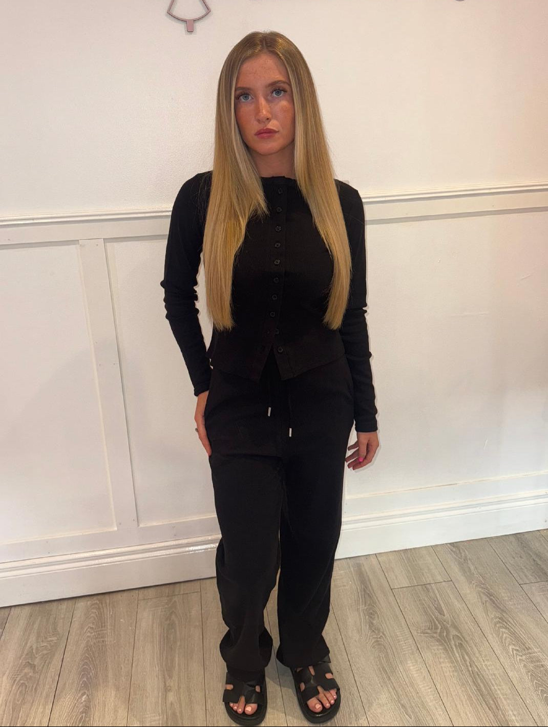 This black two-piece set features a button-up top and drawstring wide leg trousers.