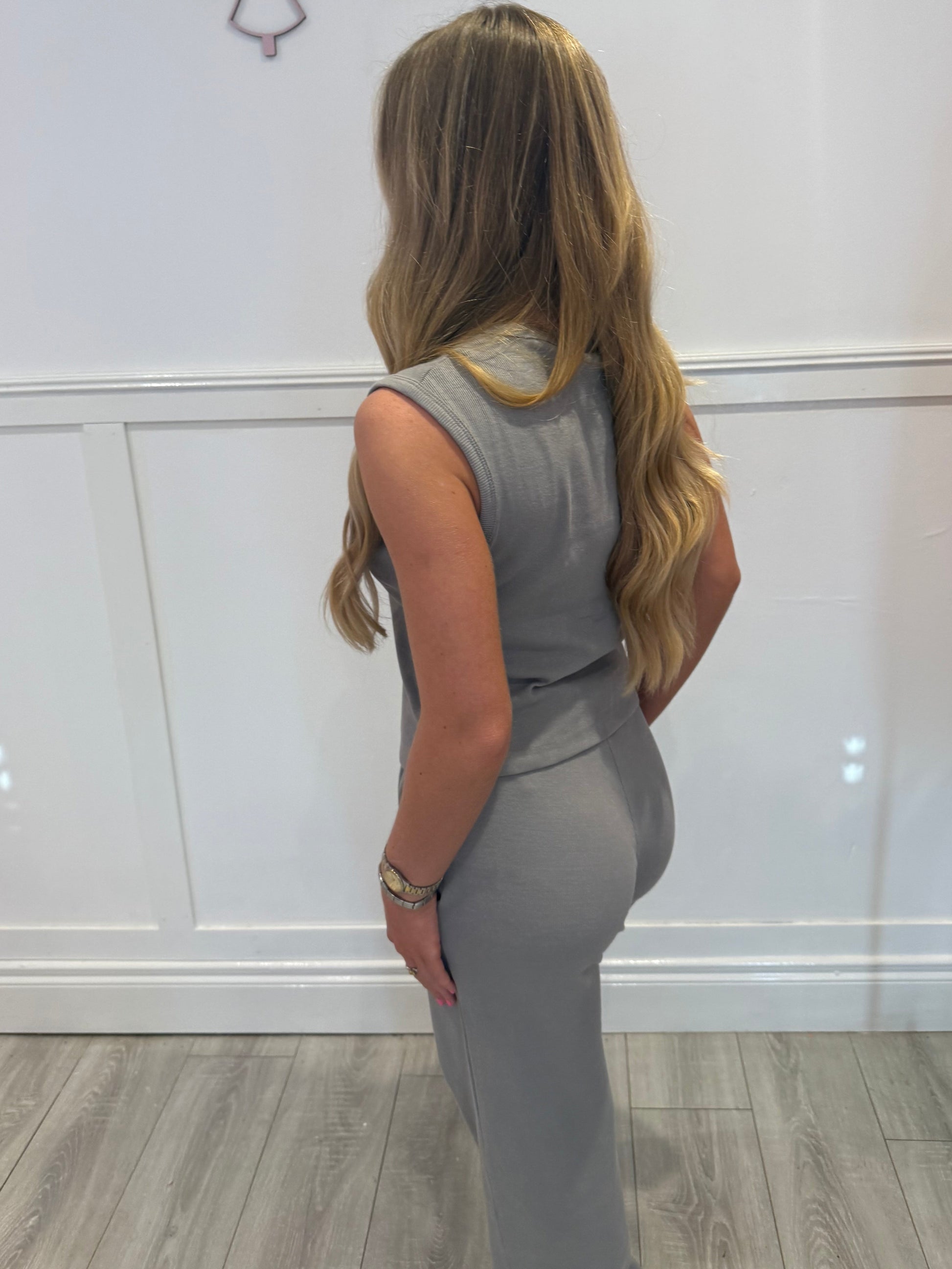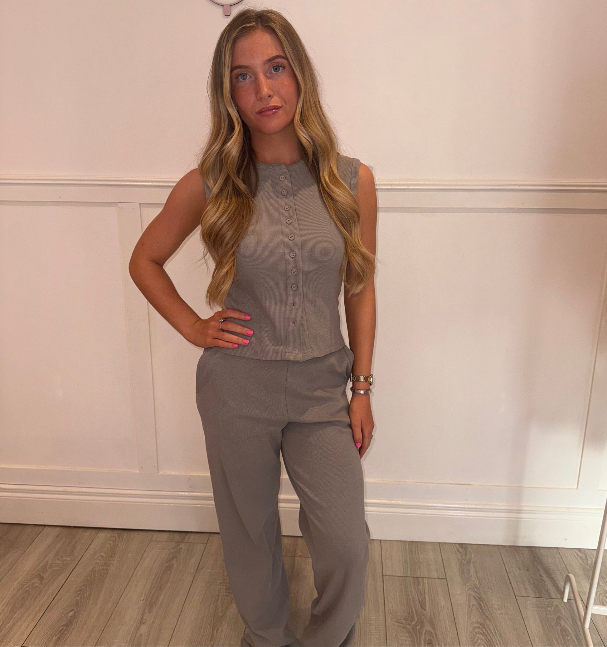 Soft, structured, and effortlessly elegant. This muted grey set pairs a button-front sleeveless top with relaxed trousers for a clean, modern silhouette. Perfect for day-to-night transitions.