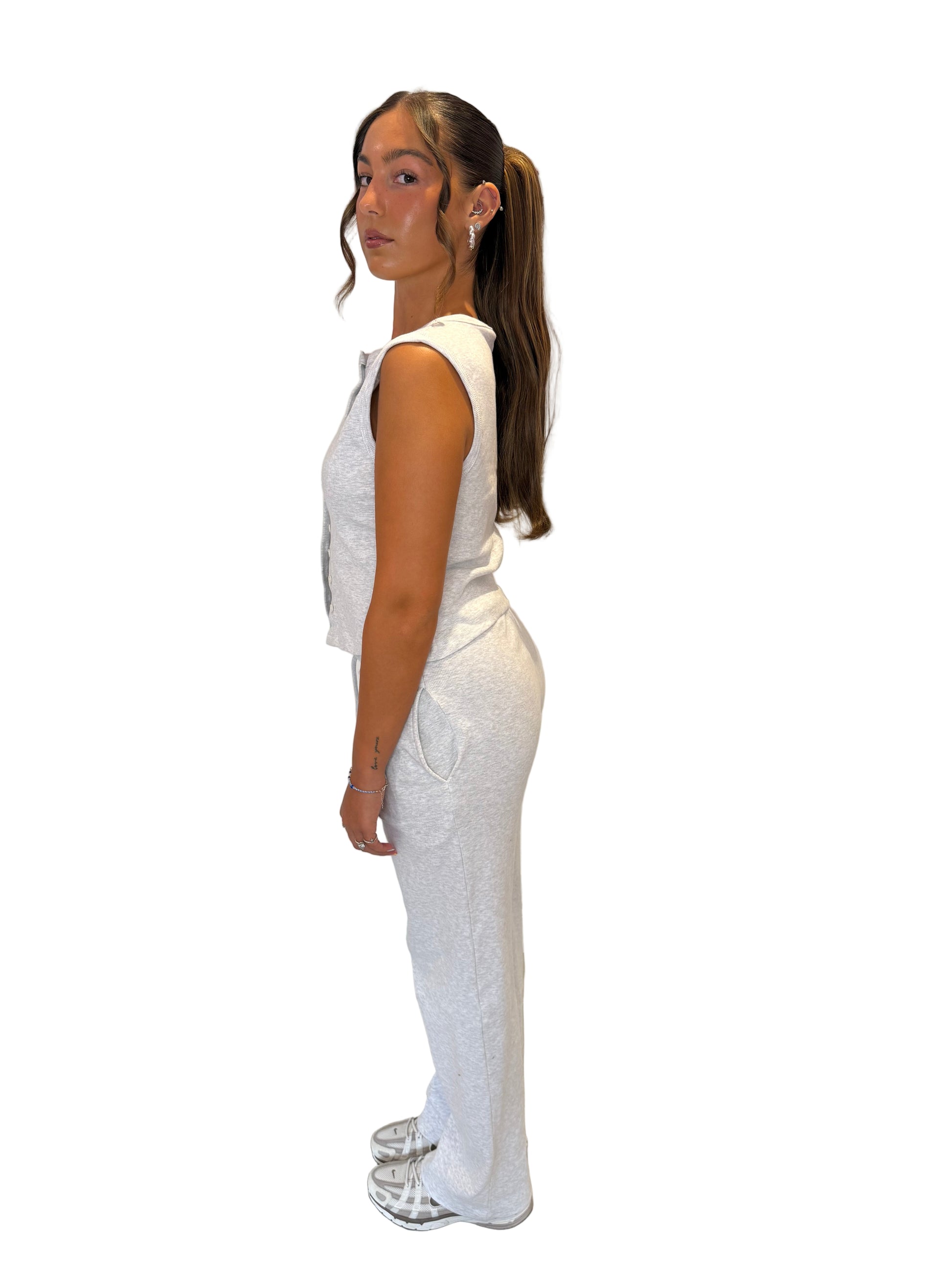 STORMY ☕️🩶 This grey two piece set features a button up top and drawstrings wide leg trousers. Perfect for dressing up or down.