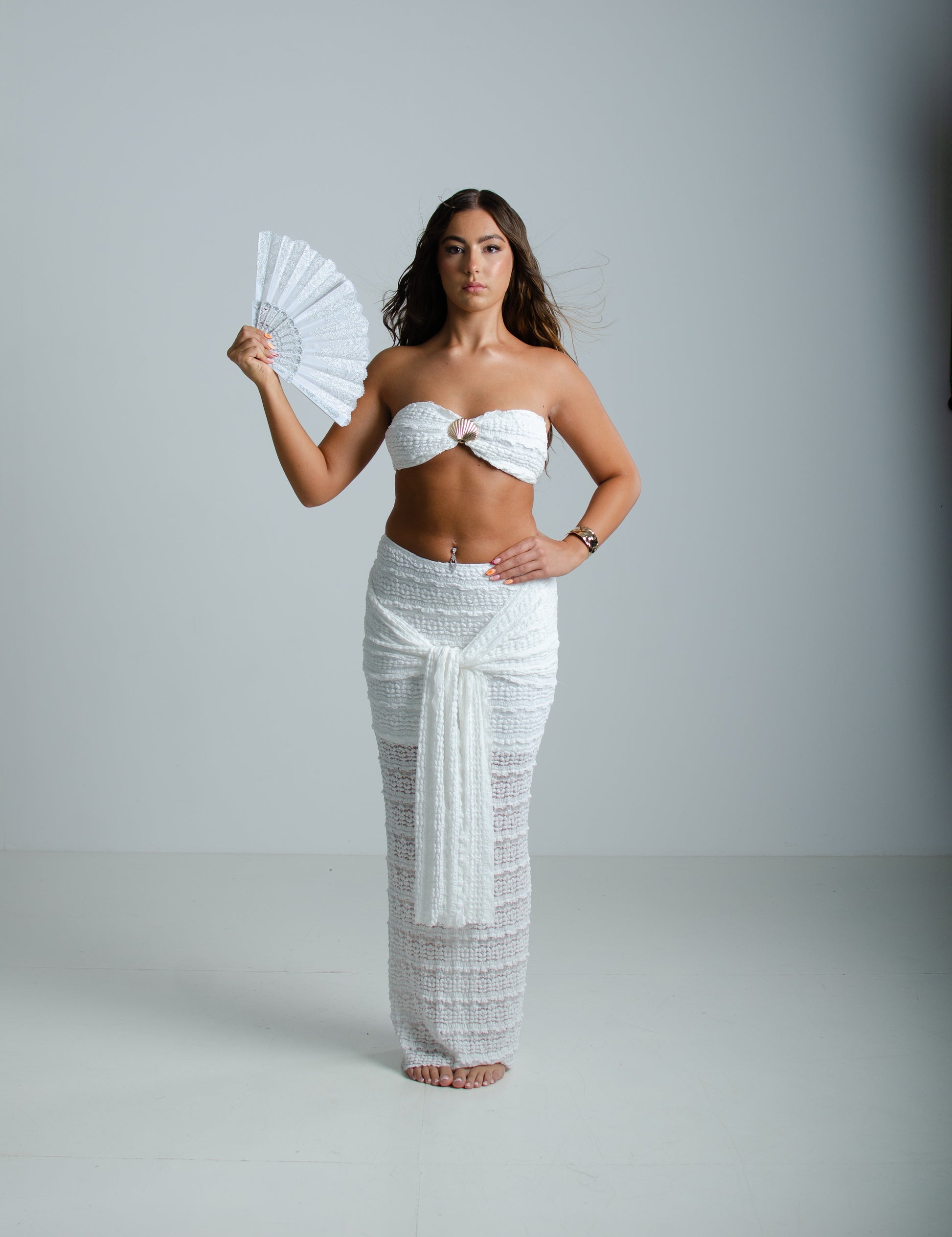 The bandeau-style top features a delicate ruched texture and is beautifully accented with a central Gold seashell detail, charm. Paired with a matching high-waisted maxi skirt, the set offers a breezy, semi-sheer silhouette, adorned with a textured wrap tie for added movement and style.