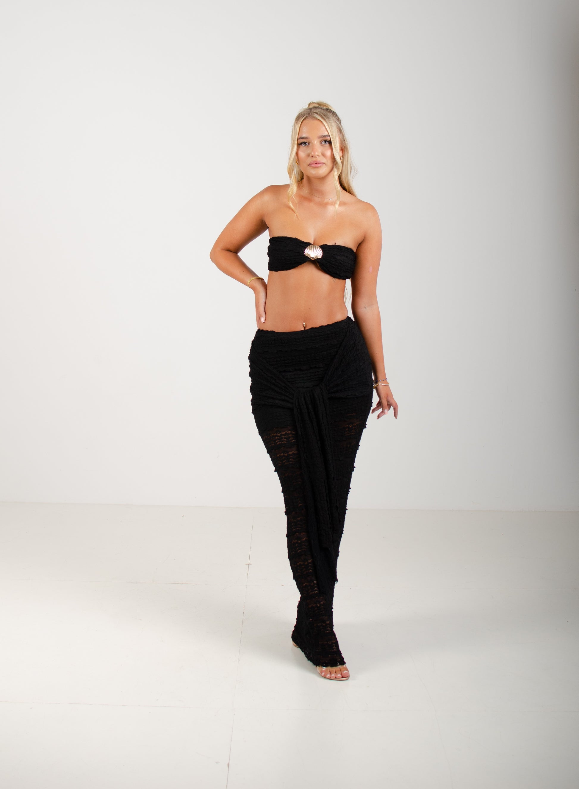 The bandeau-style top features a delicate ruched texture and beautifully accented with a central gold with a seashell detail, charm. paired with a matching high-waisted maxi skirt, the set offers a breezy, semi-sheer silhouette, adorned with a textured wrap tie for added movement and style